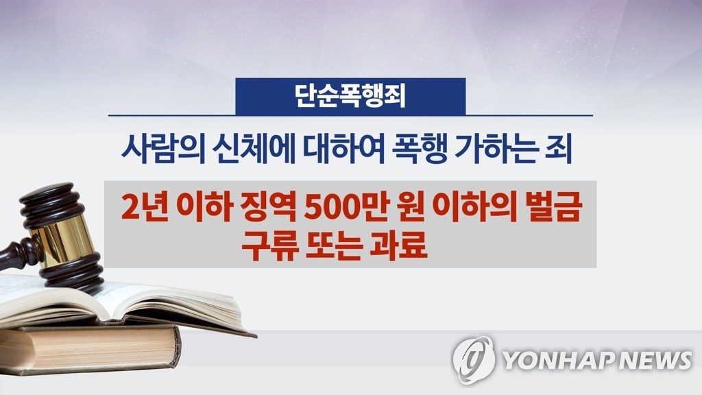 형법 260조는 폭행죄를 두고 "사람의 신체에 대해 폭행을 가한 자는 2년 이하의 징역, 500만원 이하의 벌금, 구류 또는 과료에 처한다"라고 규정한다.