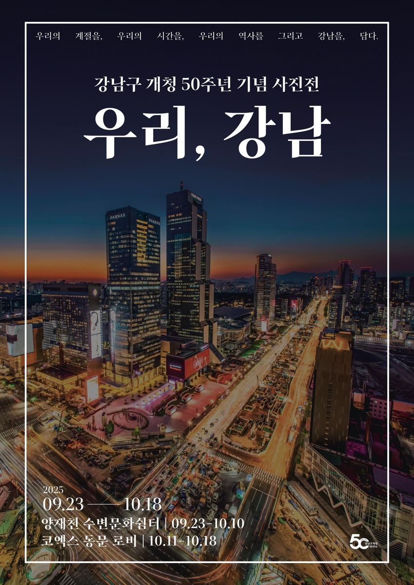 조성명 구청장은 "'우리, 강남'은 지난 50년을 함께 걸어온 강남 사람들의 시간과 오늘의 일상을 담은 전시"라며 "양재천 물길에서 시작해 코엑스로 이어지는 이번 순회전이 시민 모두에게 열린 기념의 장이 되길 바란다"고 밝혔다.