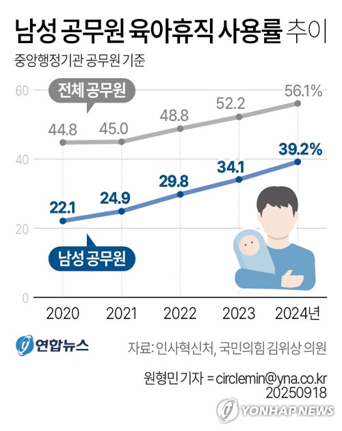 남성 공무원 육아휴직자 비율은 2020년 22.1%, 2021년 24.9%, 2022년 29.8%, 2023년 34.1%로 해마다 크게 늘고 있다. 그러나 여전히 절반 이상은 육아휴직을 못 쓰고 있다.