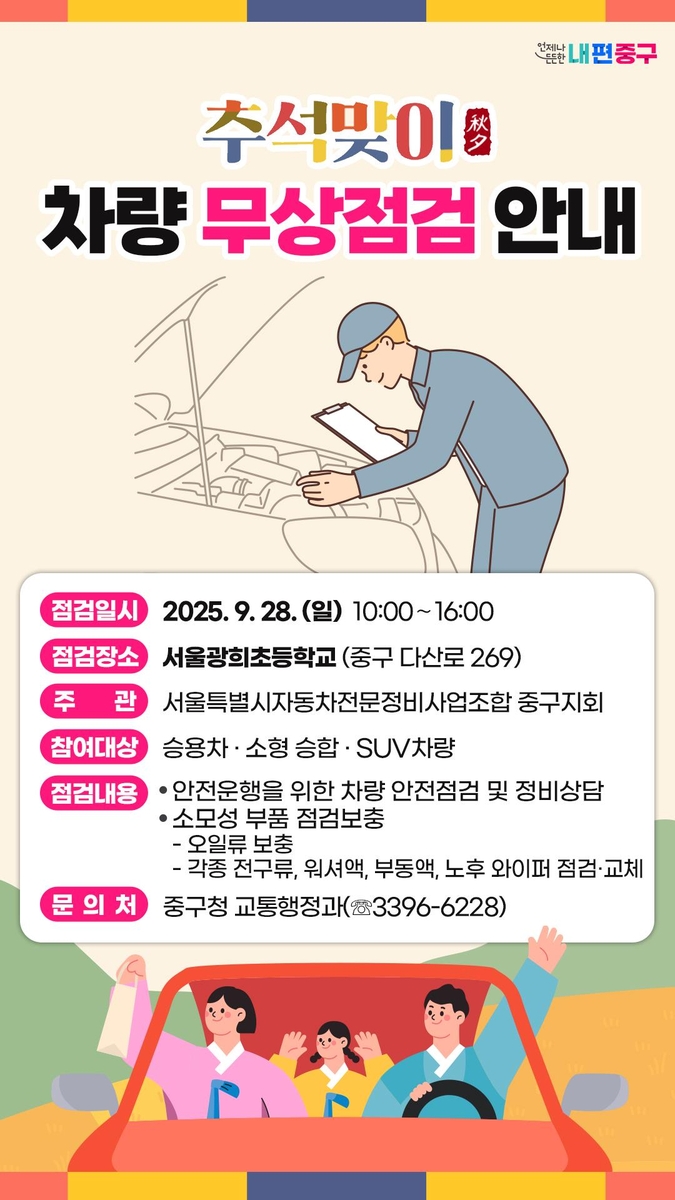 (서울=연합뉴스) 정준영 기자 = 서울 중구는 오는 28일 오전 10시~오후 4시 광희초등학교에서 서울시자동차전문정비사업조합 중구지회 주관으로 '추석맞이 차량 무상 점검'을 한다고 18일 밝혔다.