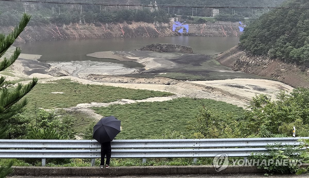 (강릉=연합뉴스) 유형재 기자 = 폭우가 쏟아진 17일 한 강릉시민이 강원 강릉지역 생활용수의 87%를 공급하는 상수원 오봉저수지를 바라보고 있다. 2025.9.1 yoo21@yna.co.kr