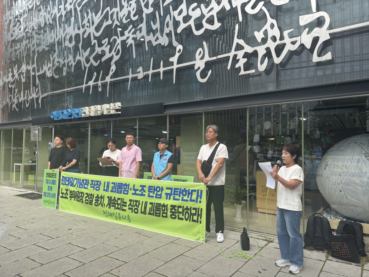 회견에 참석한 권명숙 진보당 서울시당 부위원장은 "전태일이라는 이름을 건 재단과 기념관이 노조를 탄압하고 직장 내 괴롭힘을 하고 있다"며 "피해자에게 사과하라"고 했다.