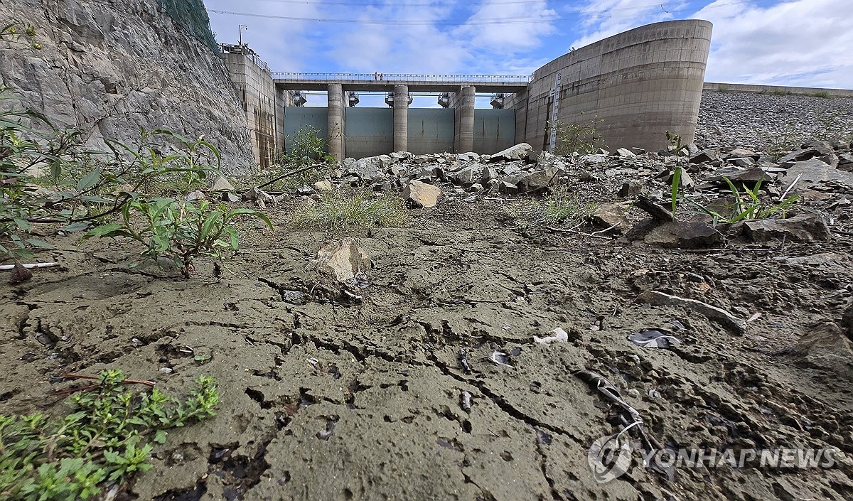 14일 강릉지역 87%의 생활용수를 공급하는 상수원 오봉저수지의 물 밖으로 드러난 맨땅이 쩍쩍 갈라진 상태를 하고 있다. 2025.9.14 yoo21@yna.co.kr
