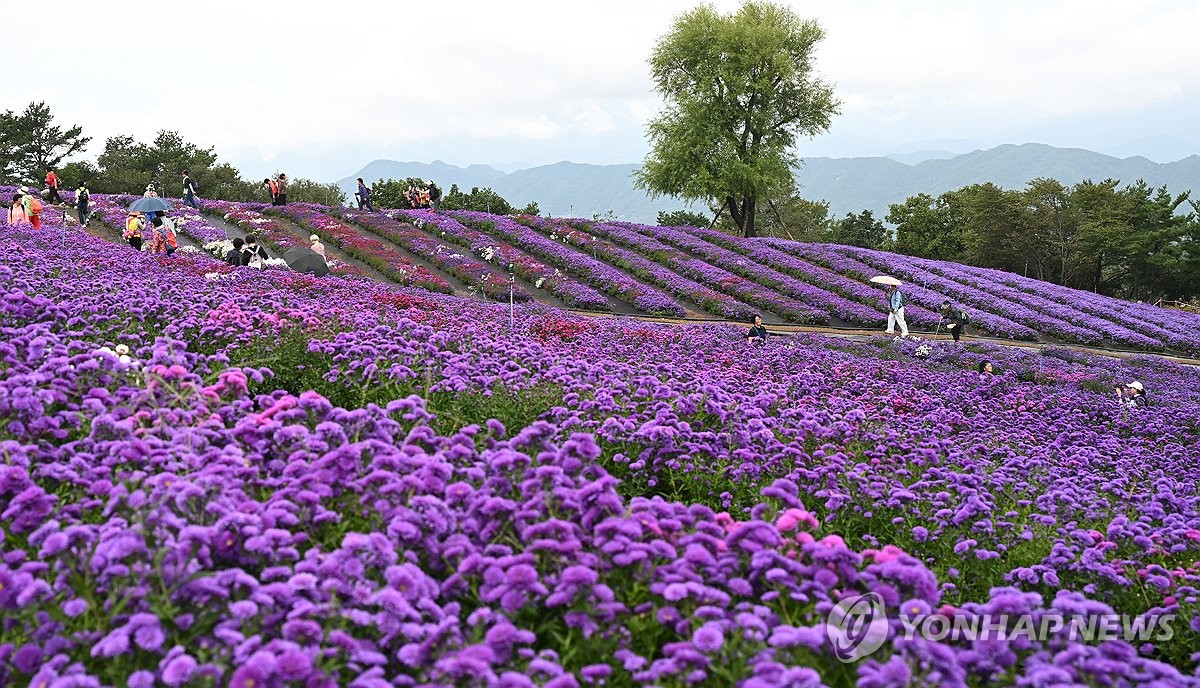 (서울=연합뉴스) 18일 경남 거창군 감악산 풍력단지 인근에 보라색 아스타 국화꽃이 활짝 피어 있다. 2025.9.18 [경남 거창군 제공. 재판매 및 DB 금지] photo@yna.co.kr